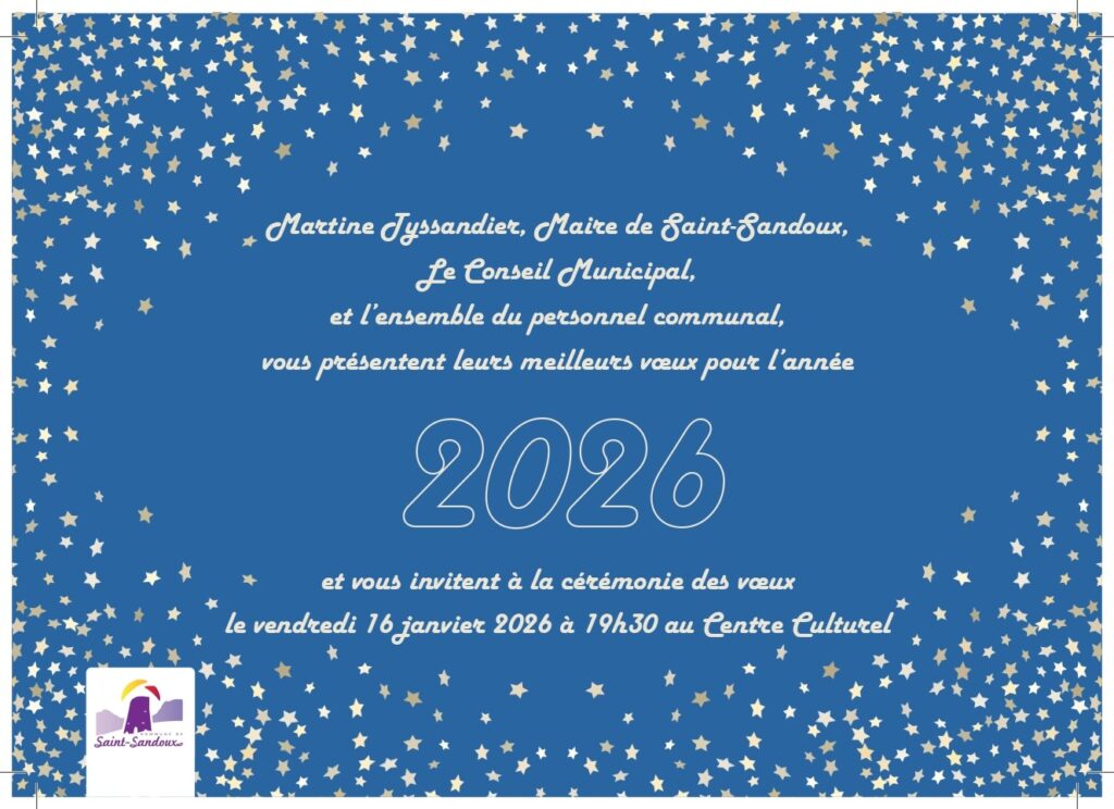 Madame le Maire, le Conseil Municipal et l’ensemble du personnel communal vous présentent leurs meilleurs vœux pour l’année 2026, et vous invitent à la cérémonie des vœux le vendredi 16 janvier 2026 à 19h30 à la Salle Culturelle